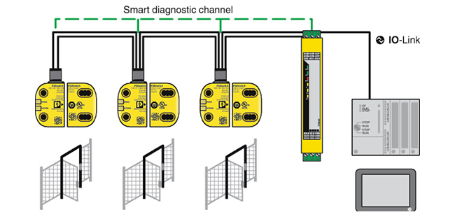 Los interruptores de seguridad de Phoenix Contact, con su canal de diagnóstico inteligente, también pueden utilizar la conexión universal de IO-Link para funciones de diagnóstico. Esta es la etapa preliminar de IO-Link Safety, por así decirlo, el próximo gran paso para IO-Link. Hasta ahora, las funciones de seguridad y los diagnósticos IO-Link se habían iniciado con cables separados. En el futuro, solo se necesitarán los tres cables de IO-Link aquí.